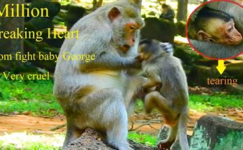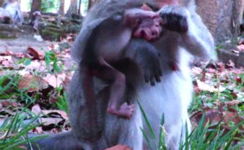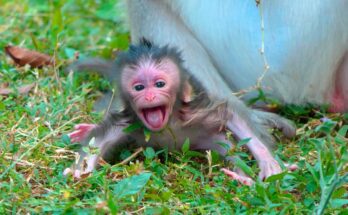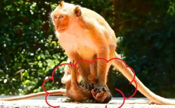 Under the warm sunlight, a tiny newborn monkey cries softly, crawling toward his mother with trembling hands and hungry eyes. He searches for comfort, for milk, for the gentle warmth …