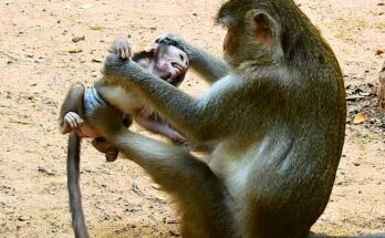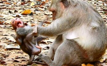 In the quiet forest, a heartbreaking scene unfolds as a young baby monkey faces harsh discipline from its mother. Instead of gentle guidance, the innocent little one receives rough treatment …
